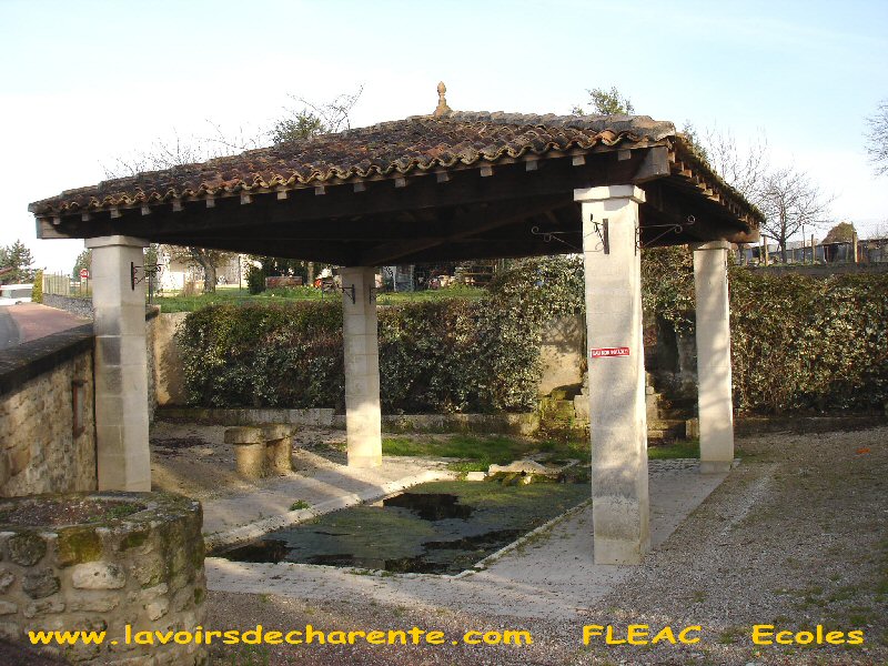 Le lavoir de l'écoleRue du 8 Mai, ce lavoir a été restauré en 1994, avec la participation de l'école de Fléac.Passer devant les écoles. Tourner à gauche juste avant. Se garer devant la maternelle. En contrebas de la route, un beau lavoir couvert, quatre piliers en pierres de taille supportent une toiture à quatre pans, recouverte de tuiles rondes. |